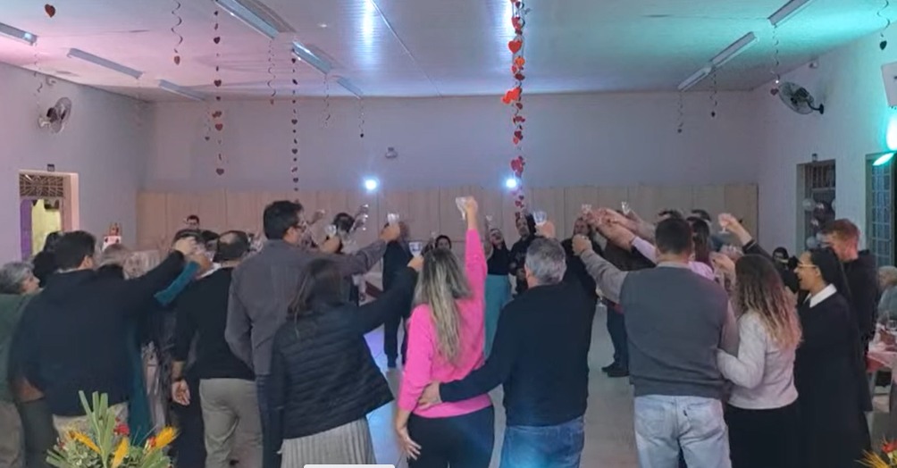 Logo após, os casais de mãos dadas entram no salão lindamente preparado pelos dirigentes dos grupos e uma linda música cantada pelo Robson da União de Famílias e as Irmãs M. Gislaine e Irmã Maria Clara os receberam com muito carinho. Assim puderam degustar um delicioso jantar, com música ao vivo, brincadeiras e um bolo delicioso.