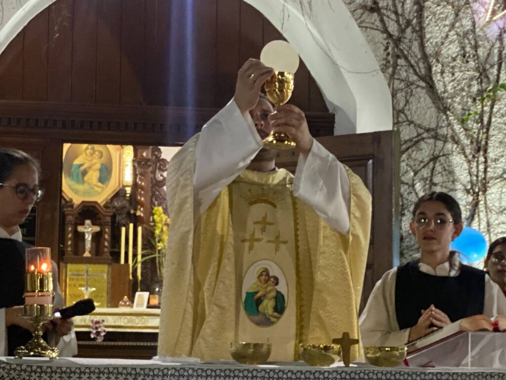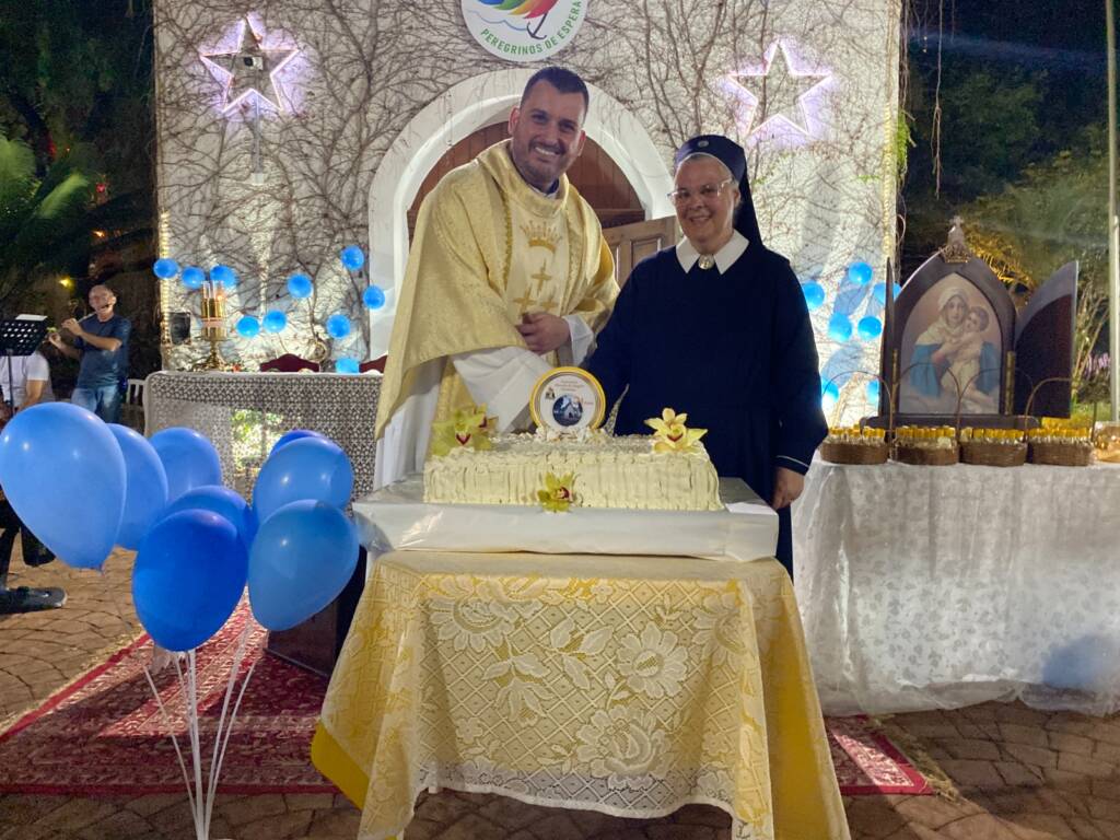 Ao final da Missa, em um momento de profunda comunhão, todos os presentes se uniram, de mãos dadas, para saudar a Mãe de Deus. O dia de festa foi finalizado com o tradicional “parabéns” e um delicioso bolo, compartilhando a alegria e a gratidão por mais um ano de bênçãos.